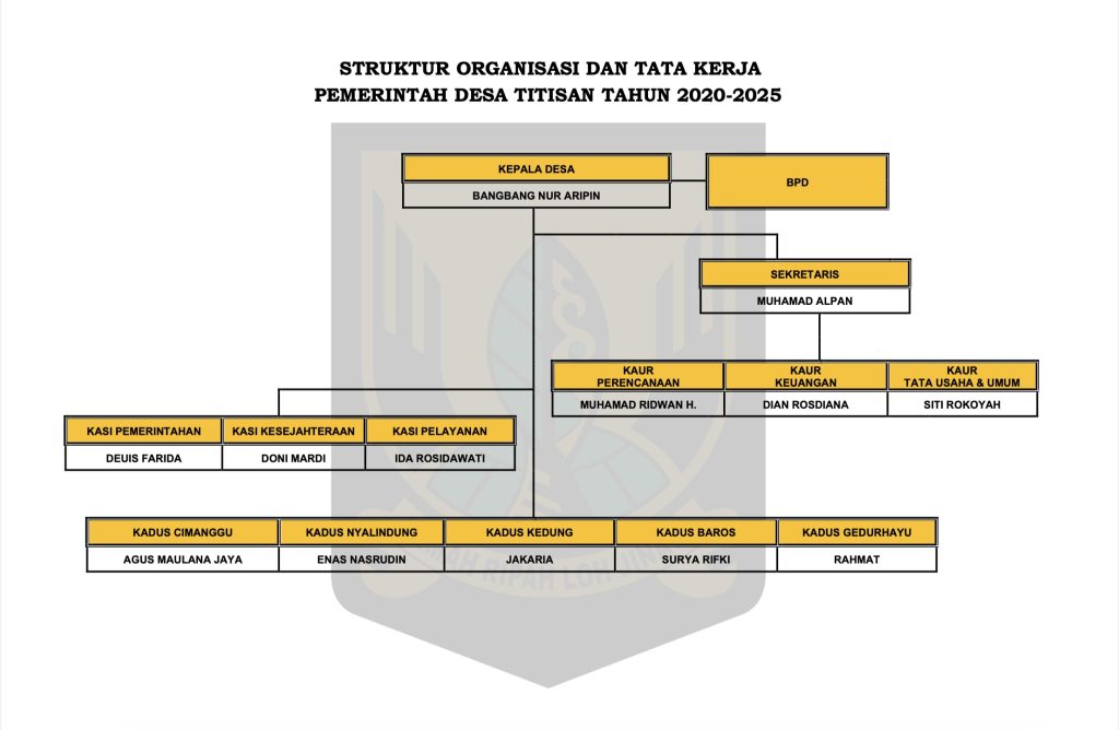 Struktur organisasi Pemerintah Desa Titisan tahun 2020-2025 telah dirancang dengan tujuan untuk meningkatkan efisiensi dan efektivitas pelayanan publik. Dengan adanya pembagian tugas yang jelas, linieritas struktur, dan fokus pada pelayanan publik, struktur organisasi ini memiliki potensi untuk membawa perubahan positif bagi masyarakat Desa Titisan. Namun, demikian, perlu dilakukan upaya-upaya perbaikan secara berkelanjutan untuk meningkatkan kinerja dan efektivitas pemerintahan desa.